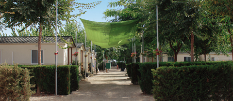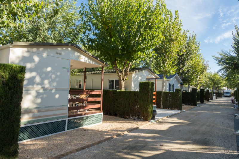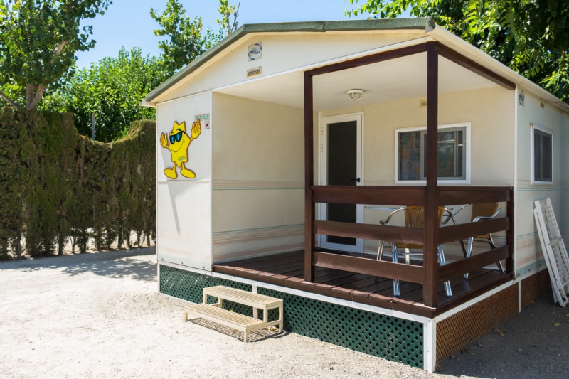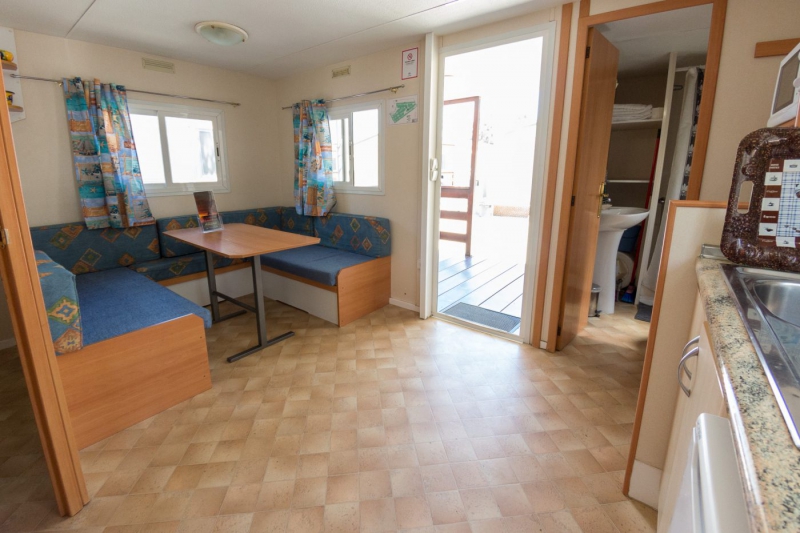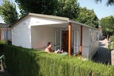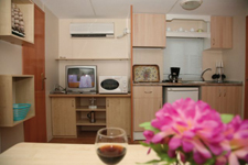 klimatizované a vytápěné mobilhomy, obytná místnost se sedacím koutem, kompletně vybavený kuchyňský kout, mikrovlnka, chladnička,  SAT-TV, sprcha/WC, terasa, parkovací místo