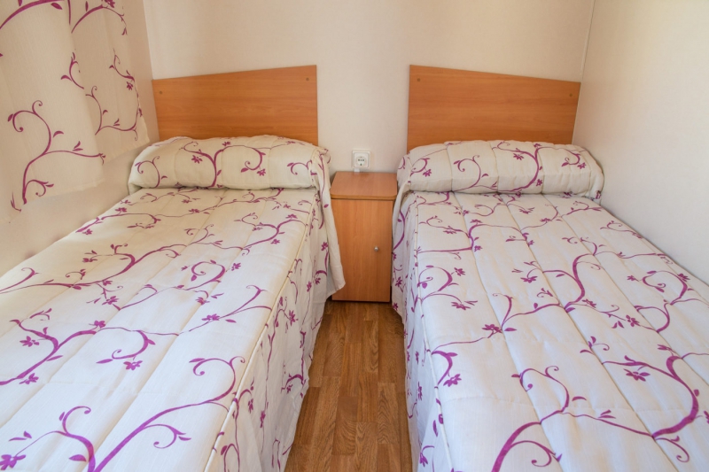 Typ 2 Superior - pro 2-4 osoby,  1 ložnice s francouskou postelí 1,35x1,9m, 1 ložnice se 2 lůžky, krytá terasa 5m2, velikost mobilhomu 27 m2